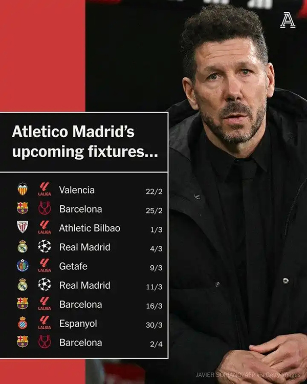 24直播網(wǎng)訊歐冠1/8決賽抽簽結(jié)果出爐,馬競(jìng)將迎戰(zhàn)同城死敵皇馬?! he Athletic報(bào)道,未來(lái)9場(chǎng)比賽,馬競(jìng)要3次踢巴薩,2次踢皇馬,賽程強(qiáng)度極高?! ●R競(jìng)未來(lái)9場(chǎng)賽程: 西甲vs...